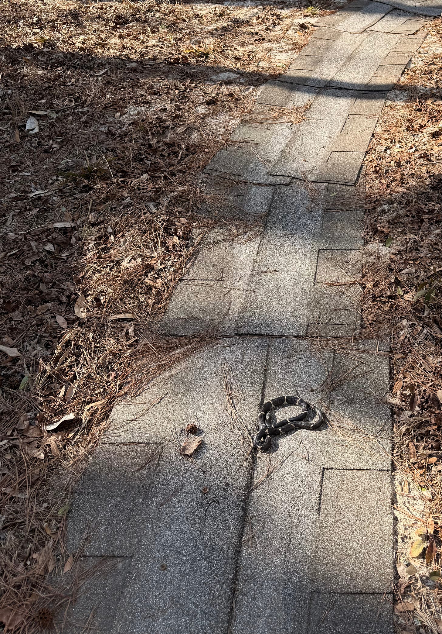 Earlier in the week, I had encountered a small kingsnake on my walkway. At first, I thought he was alive and looking for a place to warm up on the asphalt shingles. After awhile, I realized he still wasn’t moving and since the temperature was in the 40’s with the wind chill, I thought maybe he was brumating. Before I left, I created a safe place for him under a black plastic pot and placed several rocks atop it so it would not blow away. However, when I checked on him the following afternoon when it was warmer, I realized he was dead.
